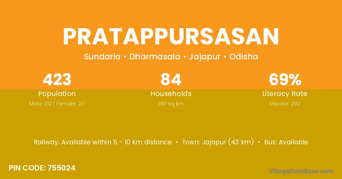 Jajapur (43 km) is the nearest town to Pratappursasan village for major economic activities and is located approximately 43 km away.