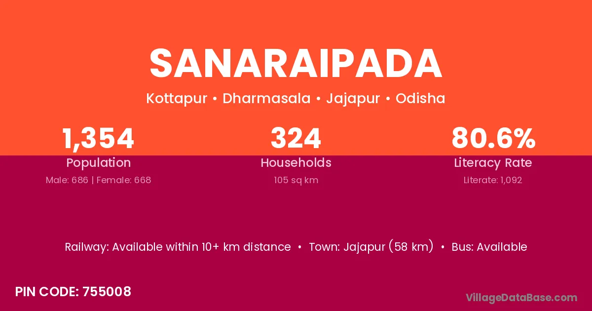 Sanaraipada village has a total population of 1,354 people, of which 686 are males and 668 are females.