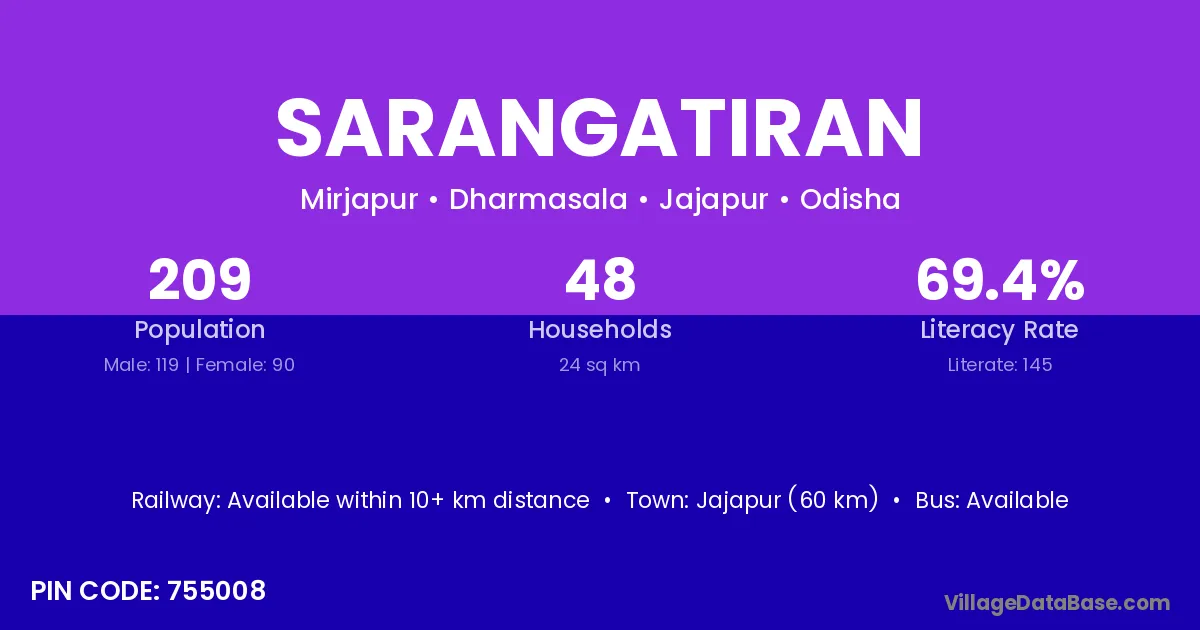 Jajapur (60 km) is the nearest town to Sarangatiran village for major economic activities and is located approximately 60 km away.