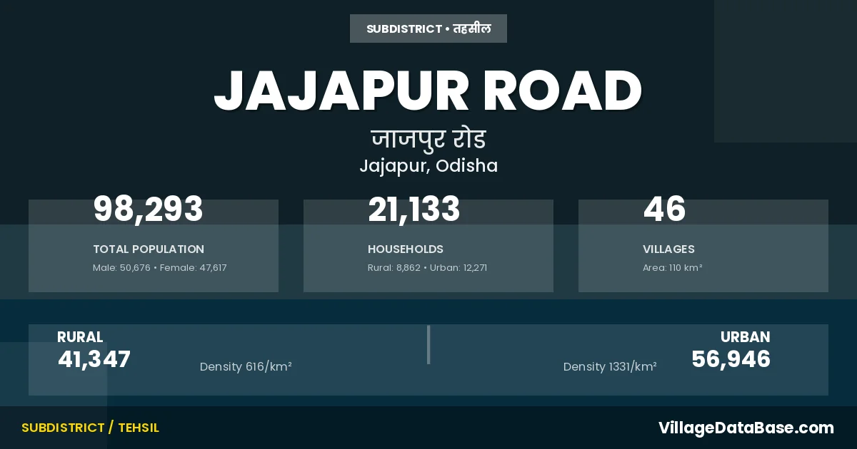 According to the 2011 census The total area of Jajapur Road Tehsil is 110 km², with a population of 98293 people. The population density is 894 inhabitants per square kilometre, and there are approximately 21133 houses in the sub district.