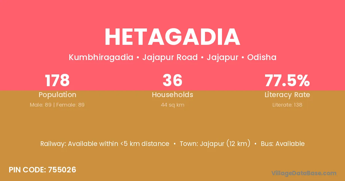 Jajapur (12 km) is the nearest town to Hetagadia village for major economic activities and is located approximately 12 km away.