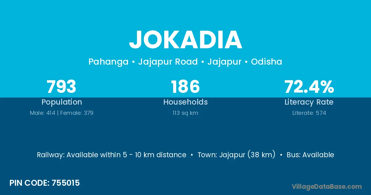 Jajapur (38 km) is the nearest town to Jokadia village for major economic activities and is located approximately 38 km away.