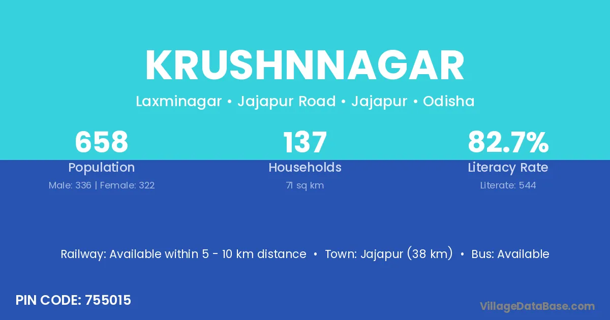 Jajapur (38 km) is the nearest town to Krushnnagar village for major economic activities and is located approximately 38 km away.