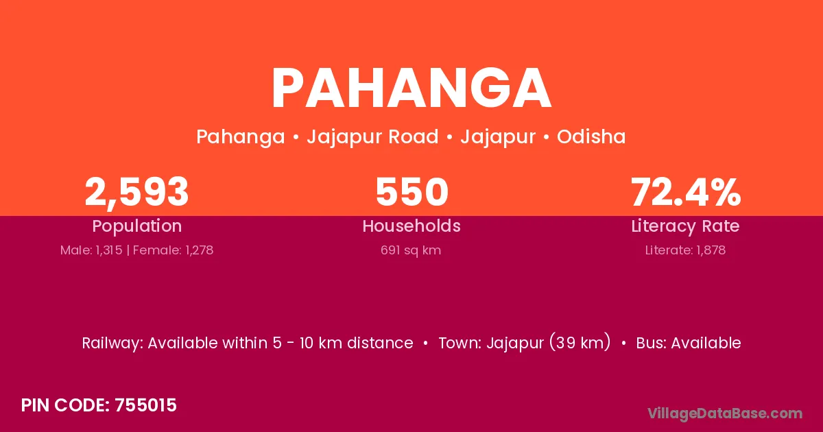 Jajapur (39 km) is the nearest town to Pahanga village for major economic activities and is located approximately 39 km away.