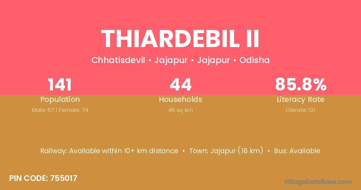 Jajapur (16 km) is the nearest town to Thiardebil Ii village for major economic activities and is located approximately 16 km away.