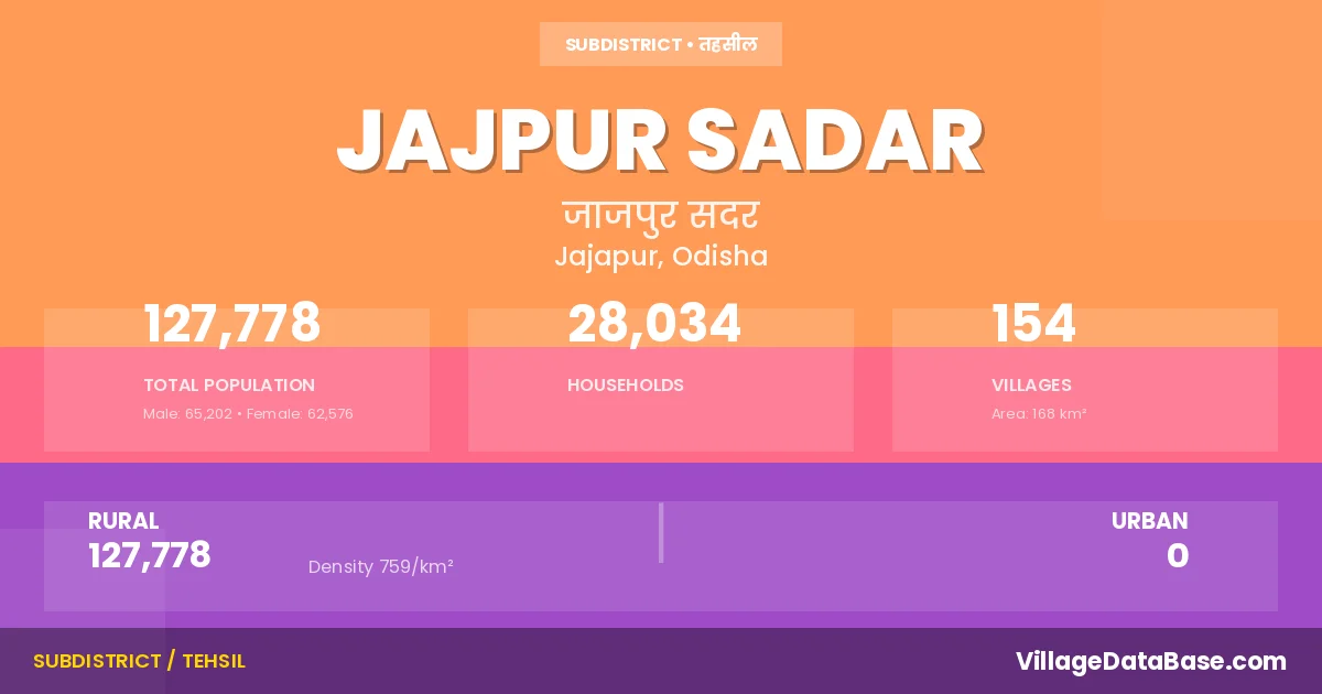 According to the 2011 census The total area of Jajpur Sadar Tehsil is 168 km², with a population of 127778 people. The population density is 759 inhabitants per square kilometre, and there are approximately 28034 houses in the sub district.
