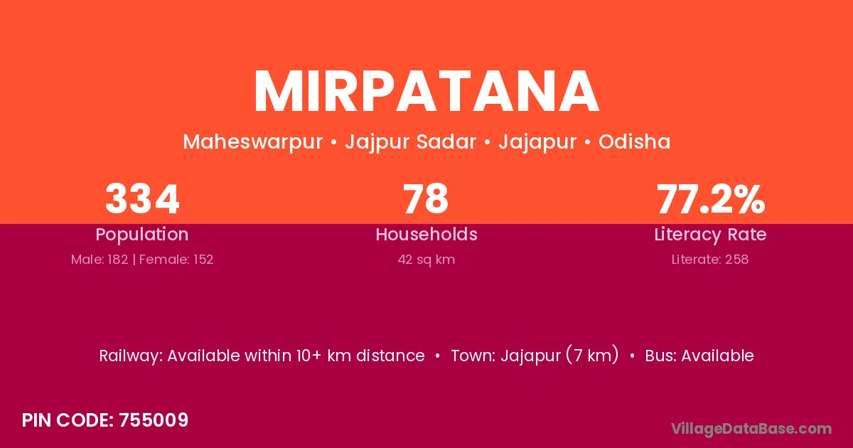 Jajapur (7 km) is the nearest town to Mirpatana village for major economic activities and is located approximately 7 km away.