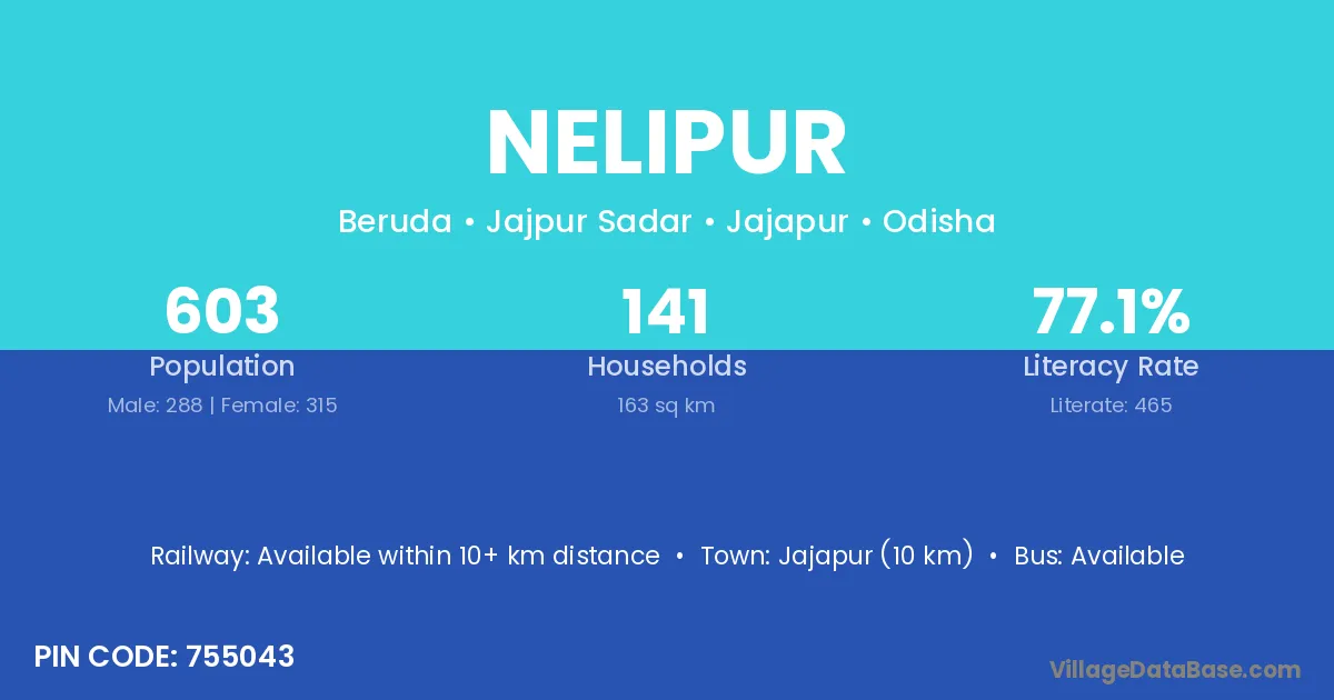 Jajapur (10 km) is the nearest town to Nelipur village for major economic activities and is located approximately 10 km away.