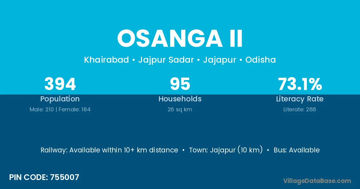 Jajapur (10 km) is the nearest town to Osanga Ii village for major economic activities and is located approximately 10 km away.