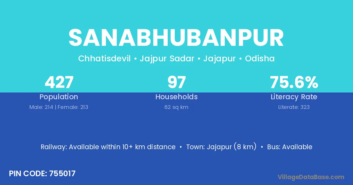 Sanabhubanpur village has a total population of 427 people, of which 214 are males and 213 are females.