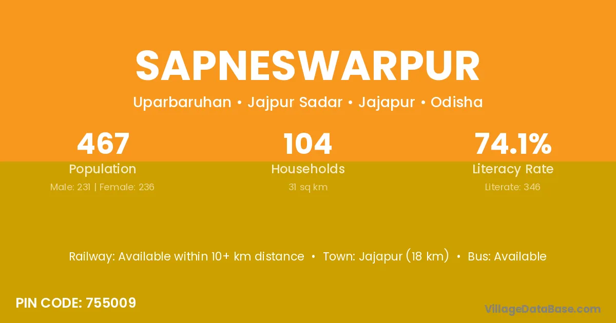 Jajapur (18 km) is the nearest town to Sapneswarpur village for major economic activities and is located approximately 18 km away.