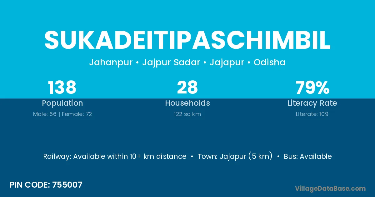 Jajapur (5 km) is the nearest town to Sukadeitipaschimbil village for major economic activities and is located approximately 5 km away.