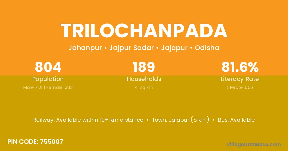 Jajapur (5 km) is the nearest town to Trilochanpada village for major economic activities and is located approximately 5 km away.