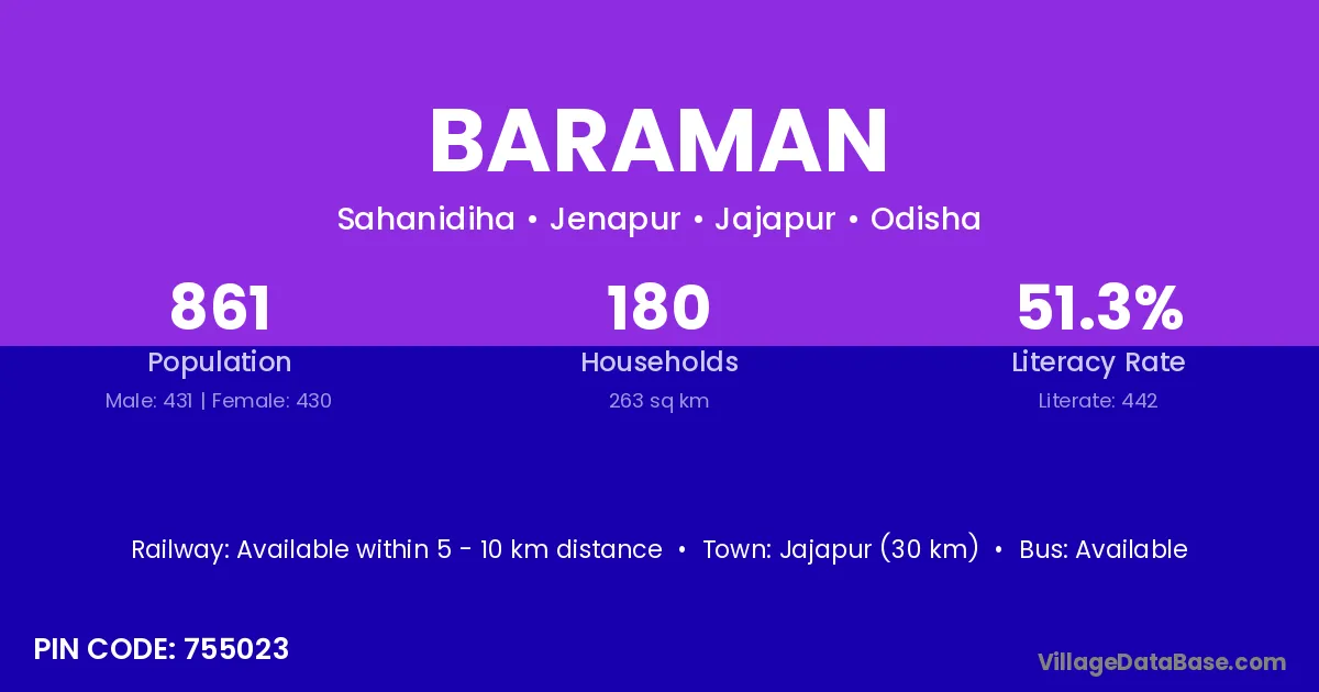 Jajapur (30 km) is the nearest town to Baraman village for major economic activities and is located approximately 30 km away.