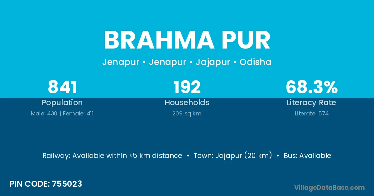 Jajapur (20 km) is the nearest town to Brahma Pur village for major economic activities and is located approximately 20 km away.