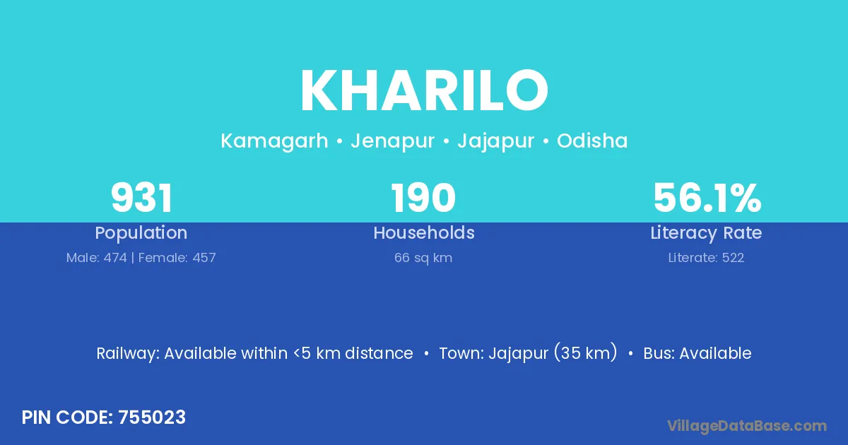 Jajapur (35 km) is the nearest town to Kharilo village for major economic activities and is located approximately 35 km away.