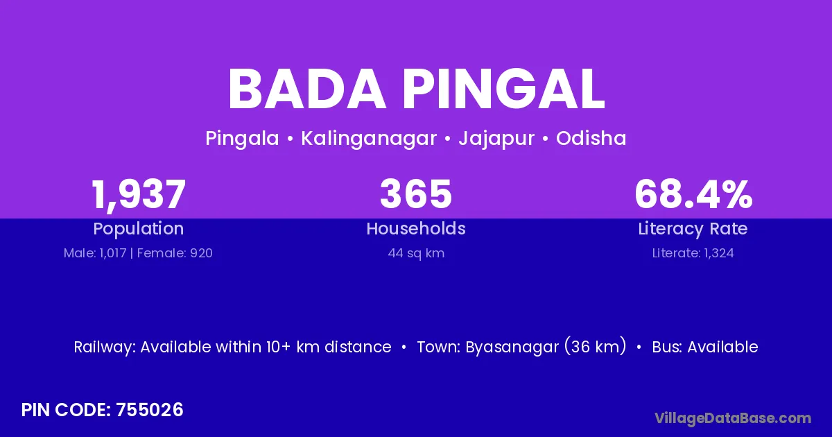 Byasanagar (36 km) is the nearest town to Bada Pingal village for major economic activities and is located approximately 36 km away.