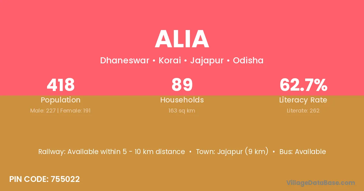 Jajapur (9 km) is the nearest town to Alia village for major economic activities and is located approximately 9 km away.
