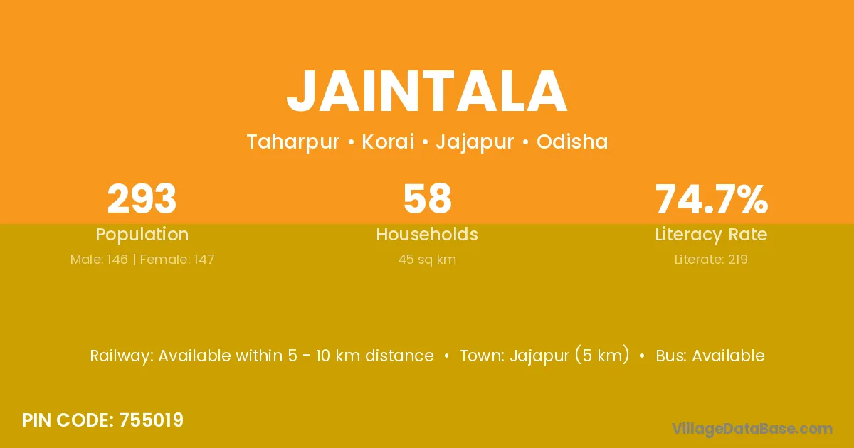 Jaintala village has a total population of 293 people, of which 146 are males and 147 are females.