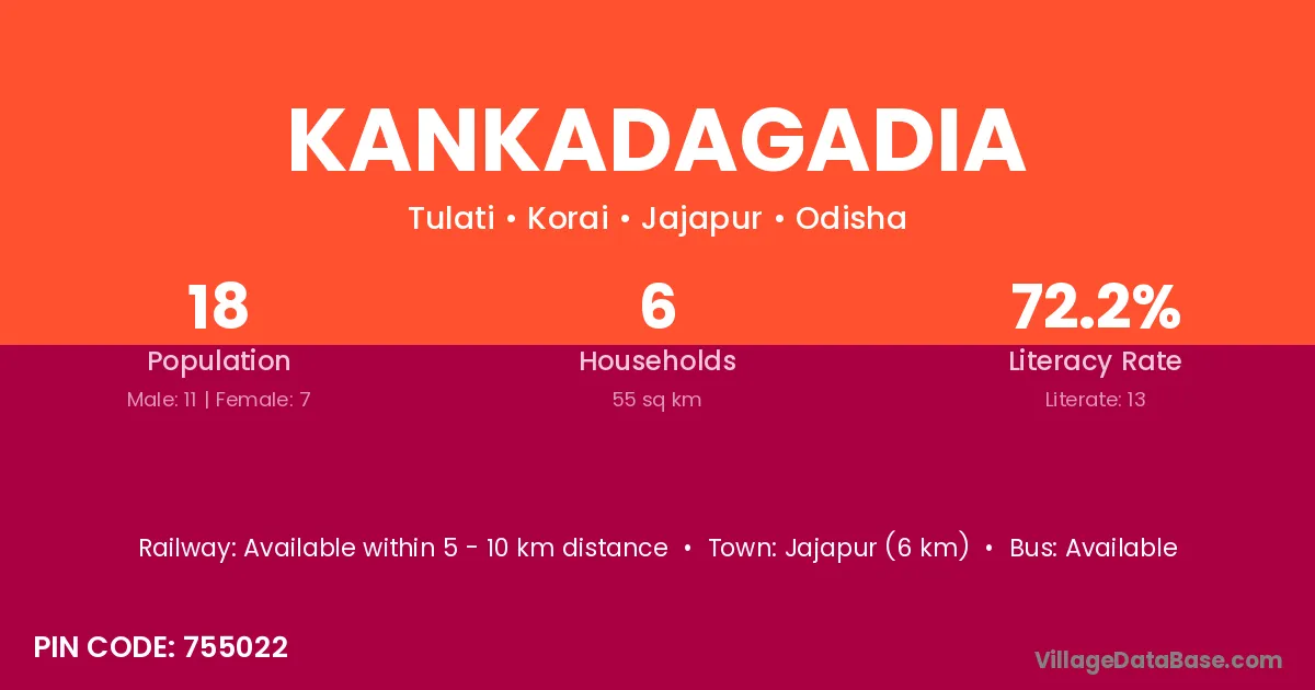 Kankadagadia village has a total population of 18 people, of which 11 are males and 7 are females.
