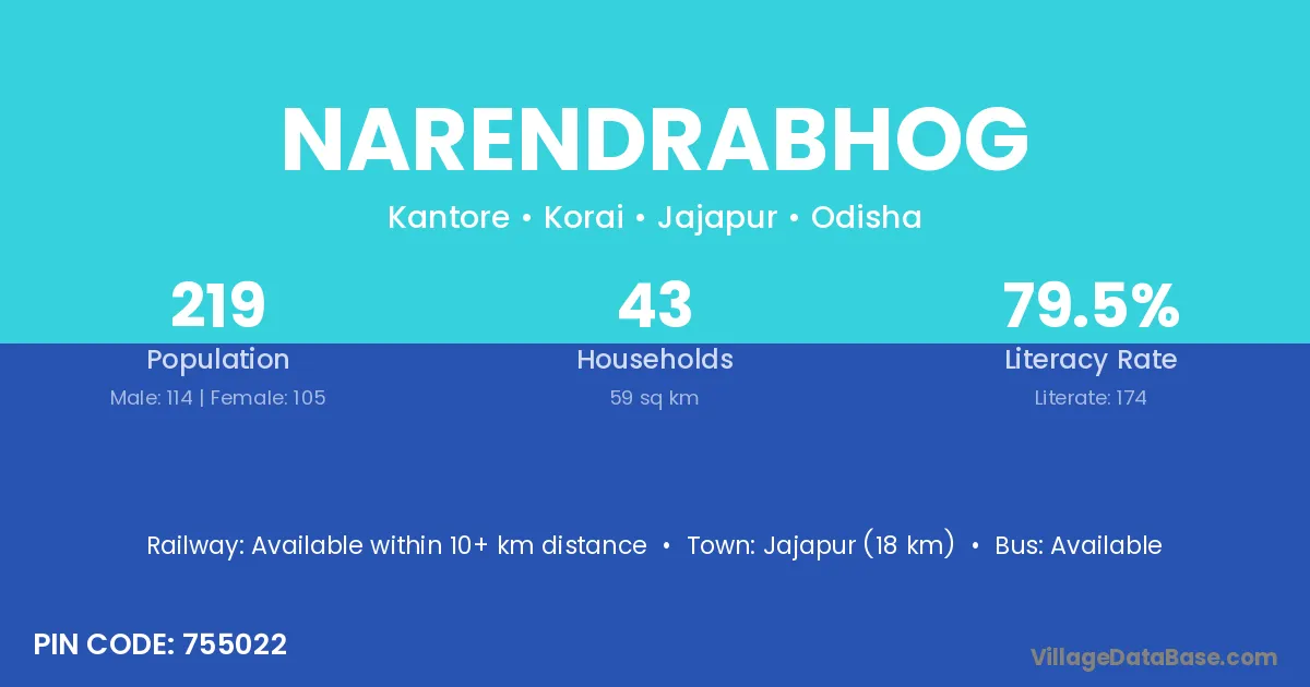 Jajapur (18 km) is the nearest town to Narendrabhog village for major economic activities and is located approximately 18 km away.