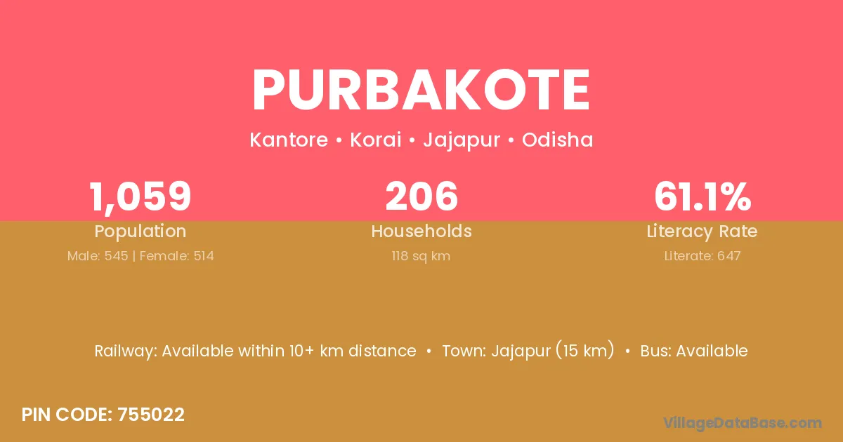Purbakote village has a total population of 1,059 people, of which 545 are males and 514 are females.