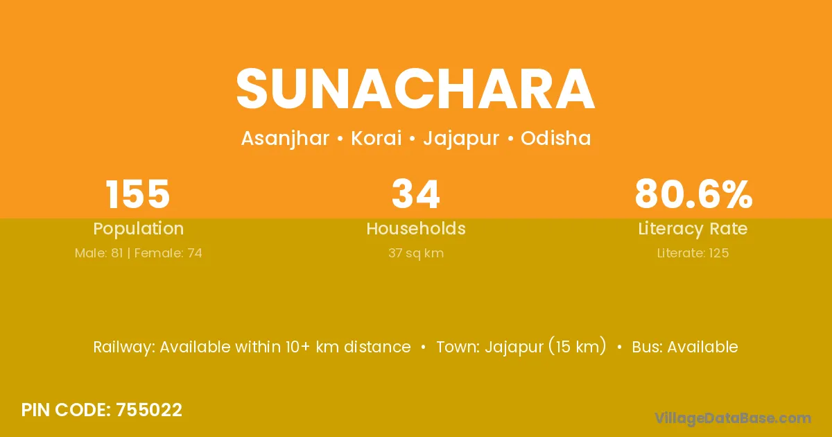 Jajapur (15 km) is the nearest town to Sunachara village for major economic activities and is located approximately 15 km away.