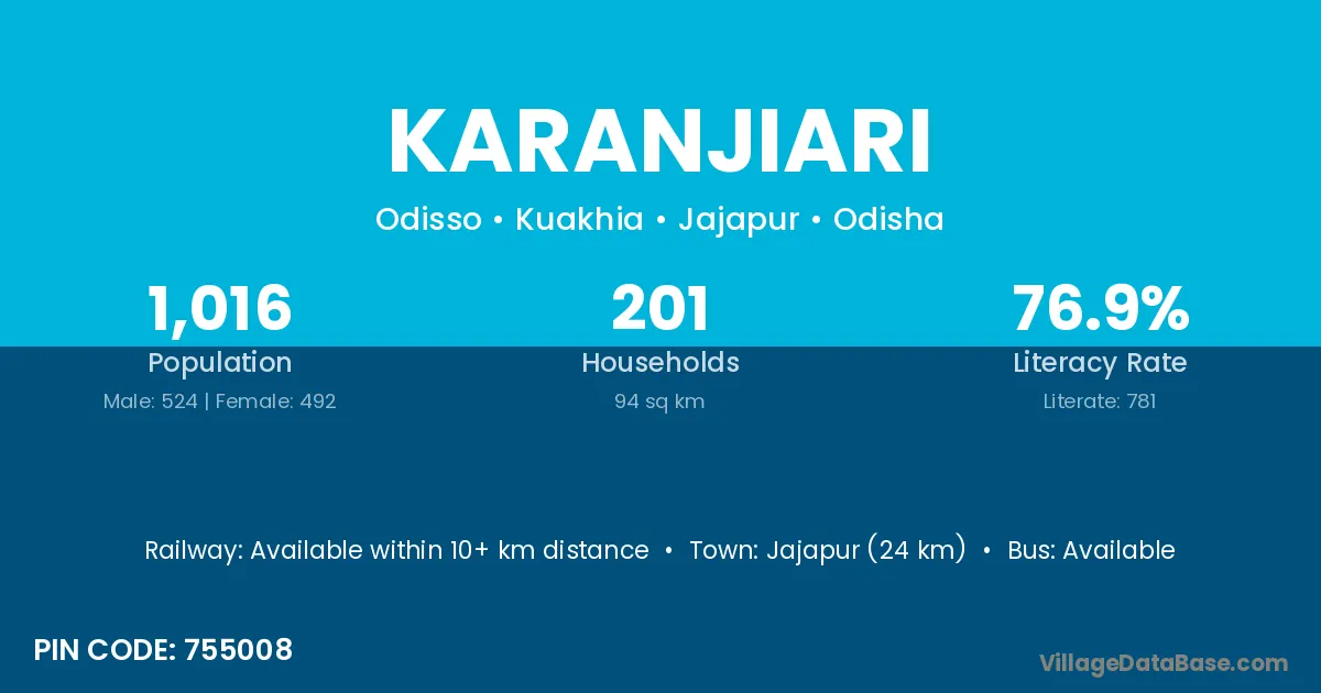 Jajapur (24 km) is the nearest town to Karanjiari village for major economic activities and is located approximately 24 km away.