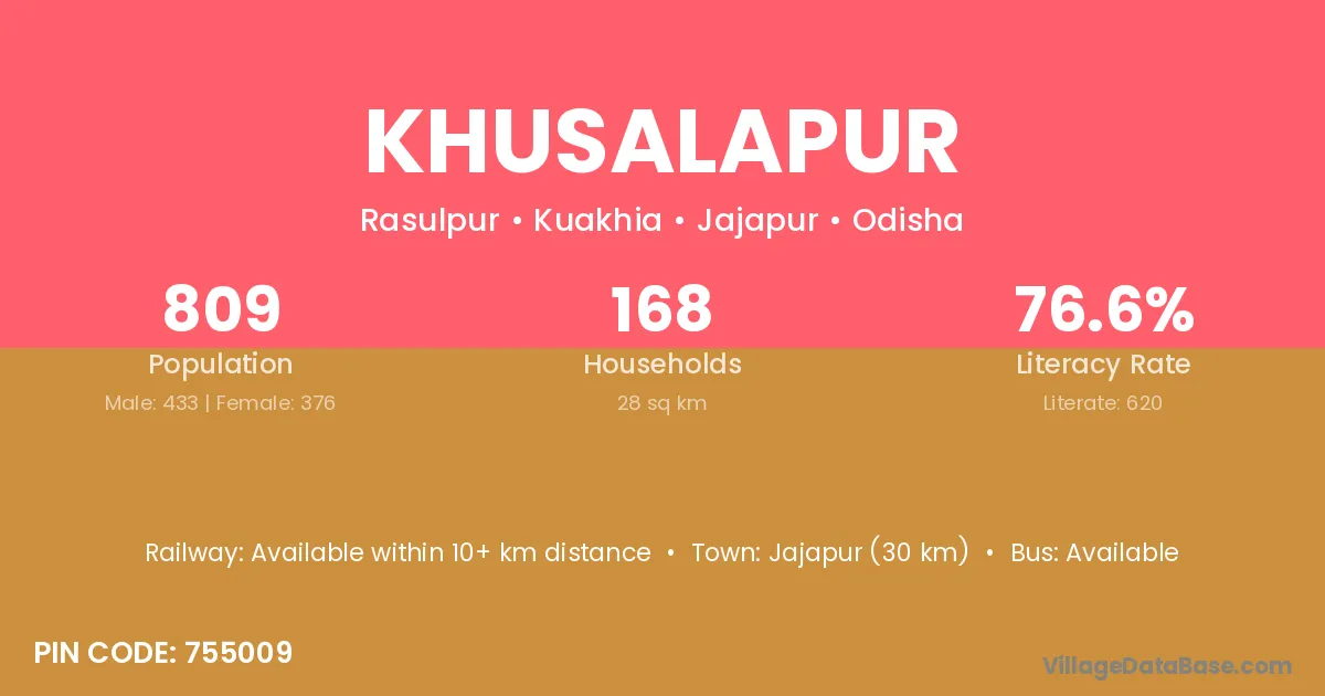 Jajapur (30 km) is the nearest town to Khusalapur village for major economic activities and is located approximately 30 km away.