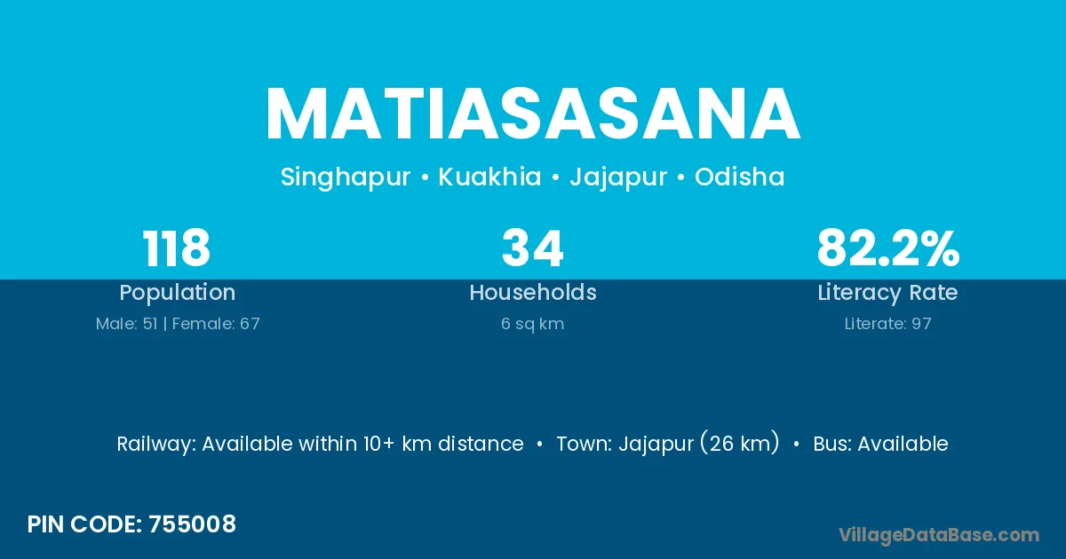 Jajapur (26 km) is the nearest town to Matiasasana village for major economic activities and is located approximately 26 km away.