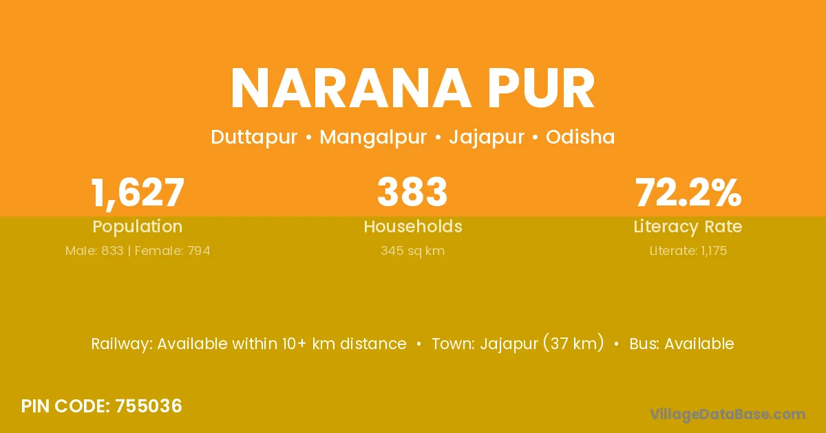 Jajapur (37 km) is the nearest town to Narana Pur village for major economic activities and is located approximately 37 km away.