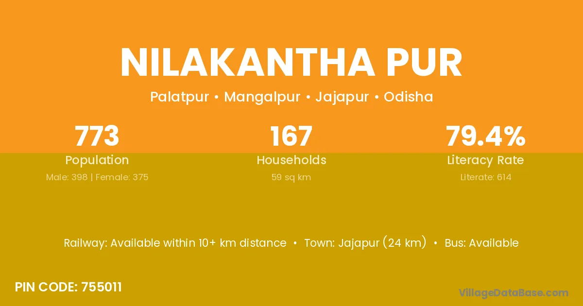 Jajapur (24 km) is the nearest town to Nilakantha Pur village for major economic activities and is located approximately 24 km away.