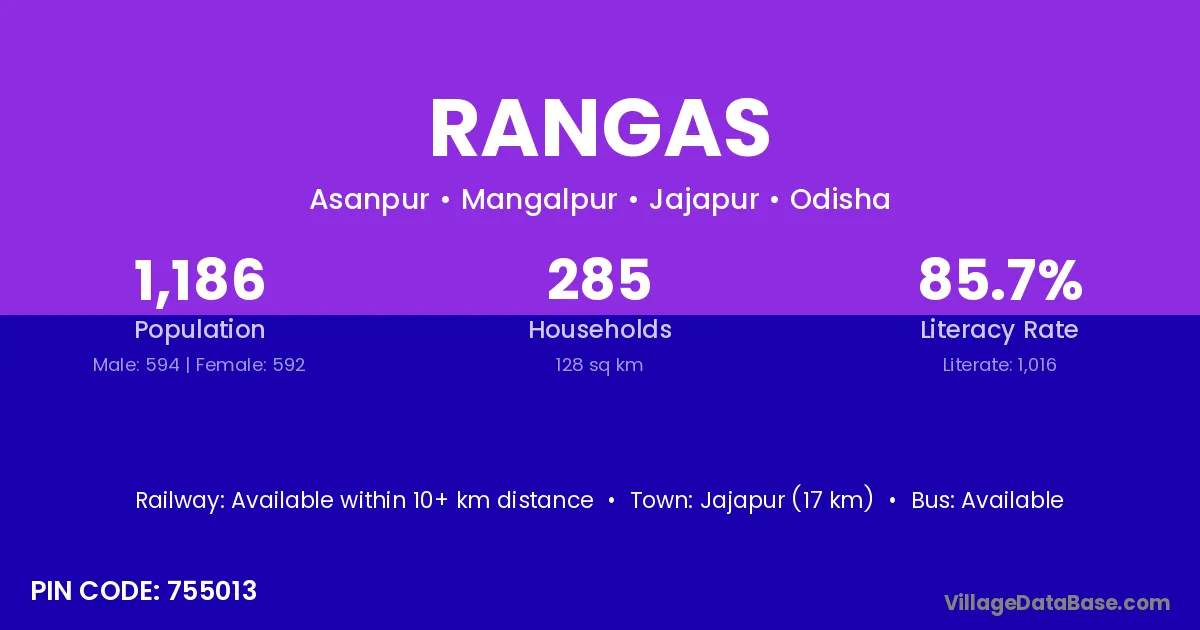 Jajapur (17 km) is the nearest town to Rangas village for major economic activities and is located approximately 17 km away.
