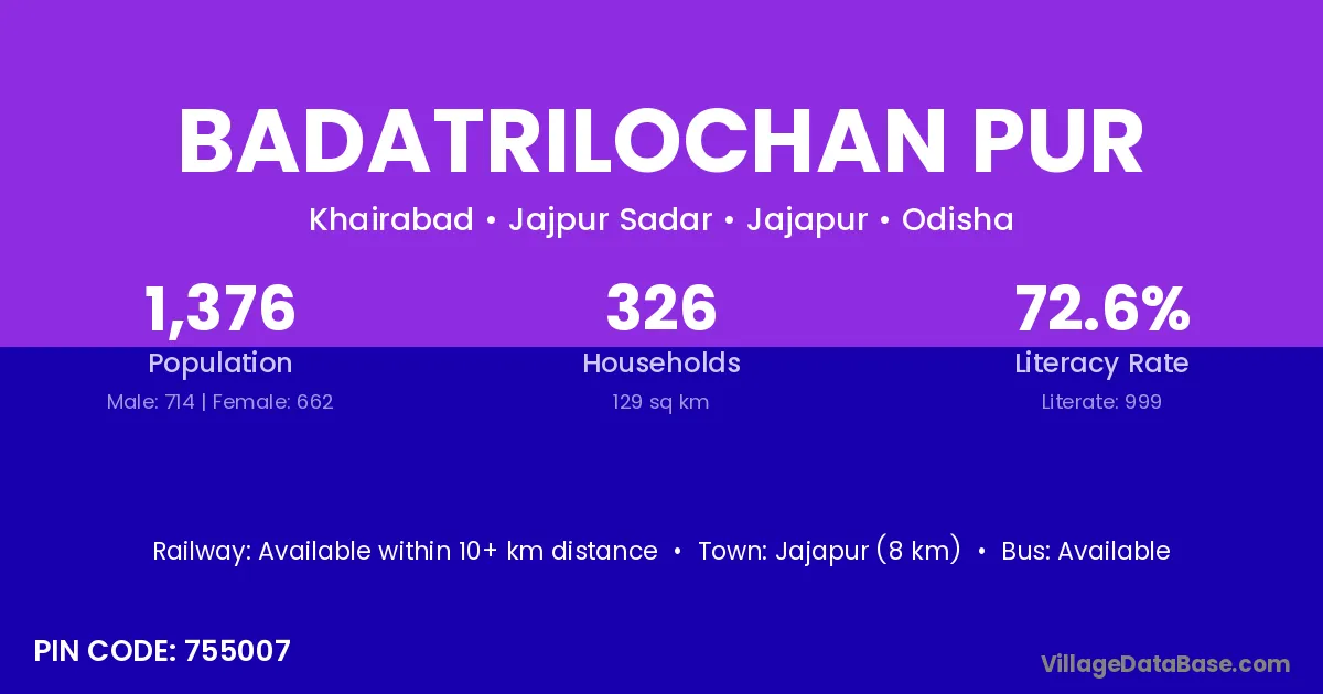 Jajapur (20 km) is the nearest town to Badatrilochan Pur village for major economic activities and is located approximately 20 km away.