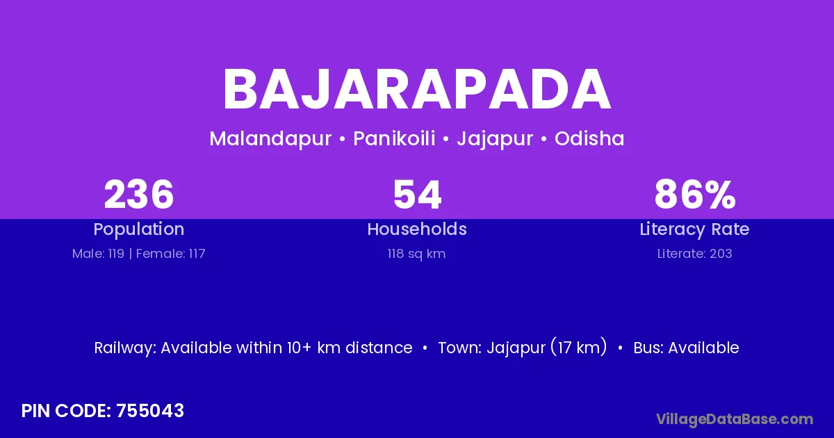 Bajarapada village has a total population of 236 people, of which 119 are males and 117 are females.
