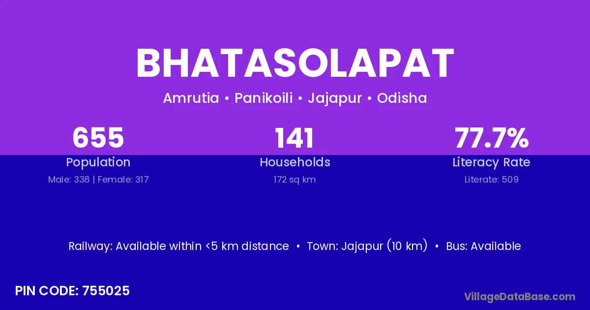 Jajapur (10 km) is the nearest town to Bhatasolapat village for major economic activities and is located approximately 10 km away.