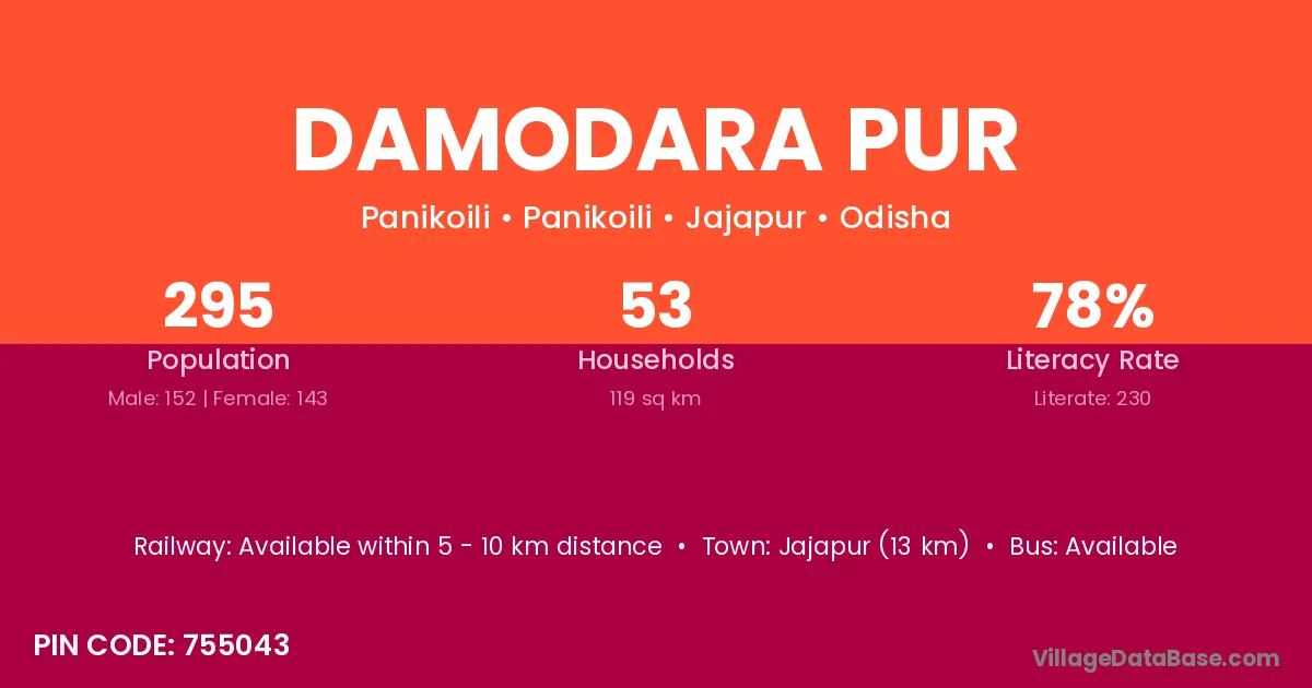 Jajapur (13 km) is the nearest town to Damodara Pur village for major economic activities and is located approximately 13 km away.