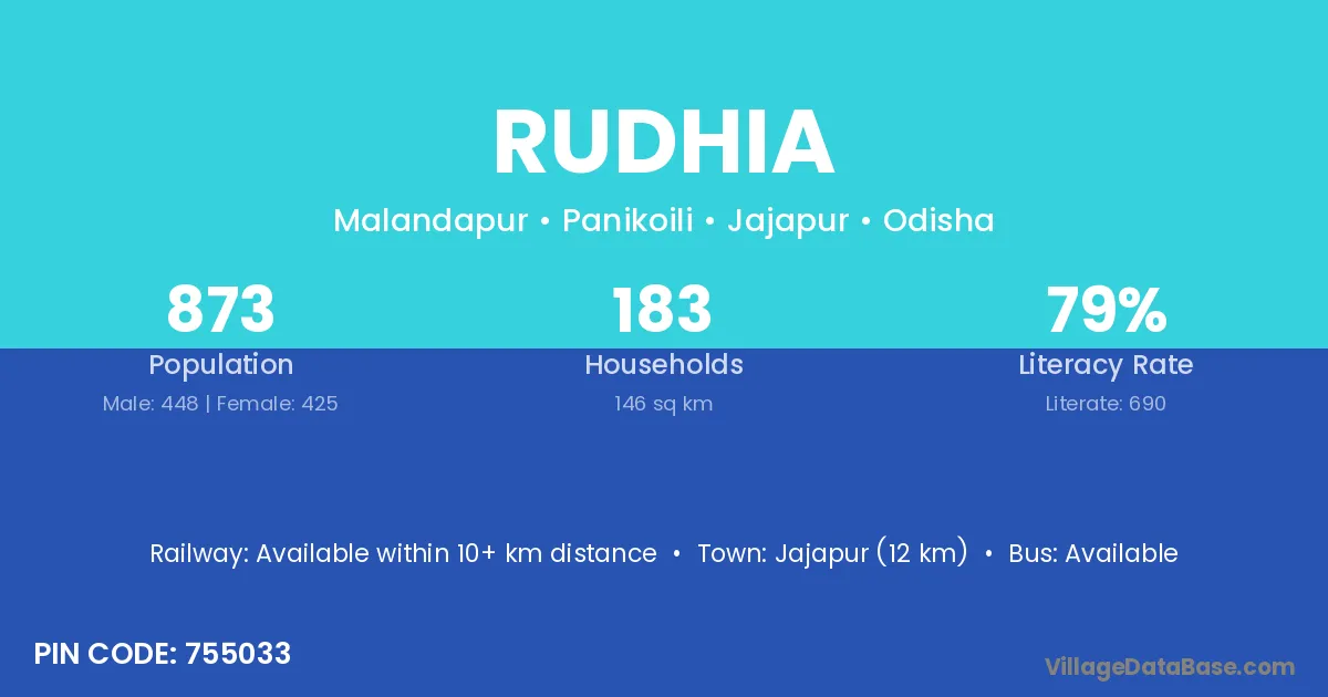 Jajapur (12 km) is the nearest town to Rudhia village for major economic activities and is located approximately 12 km away.
