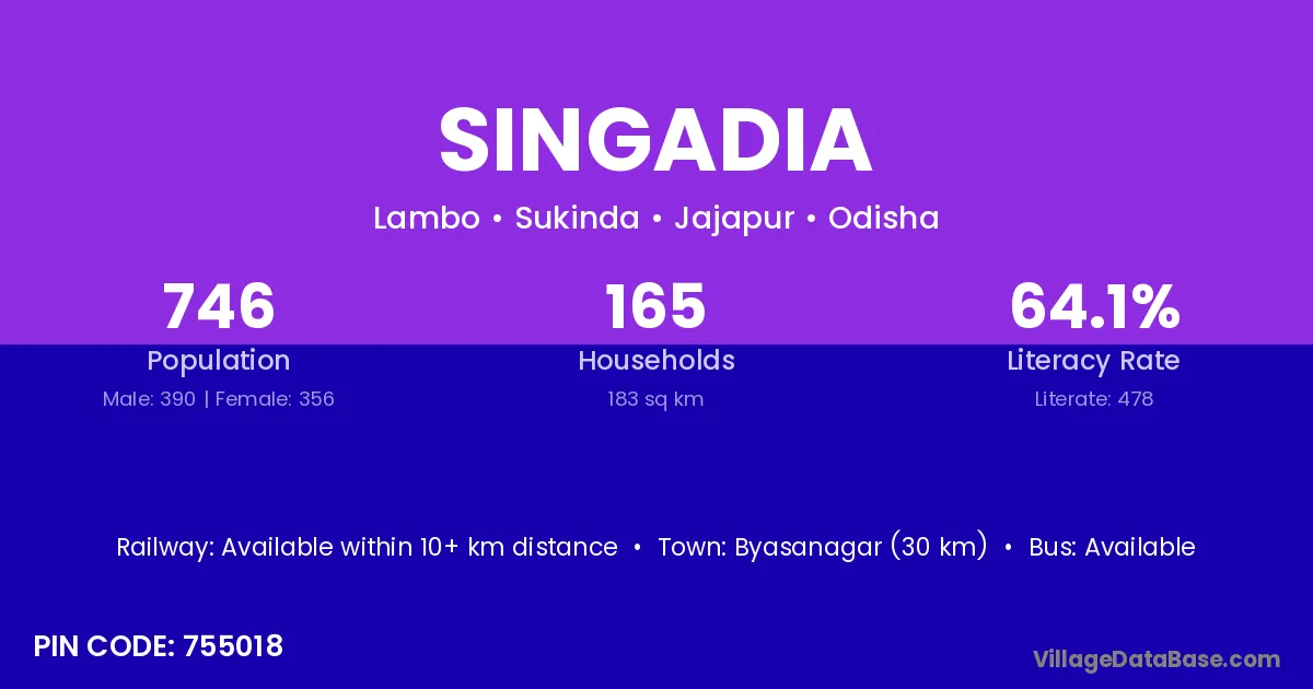Byasanagar (30 km) is the nearest town to Singadia village for major economic activities and is located approximately 30 km away.
