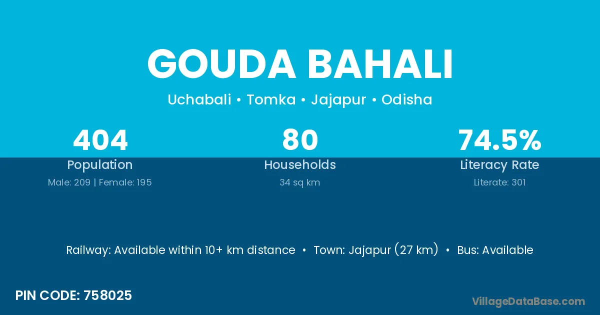 Jajapur (27 km) is the nearest town to Gouda Bahali village for major economic activities and is located approximately 27 km away.