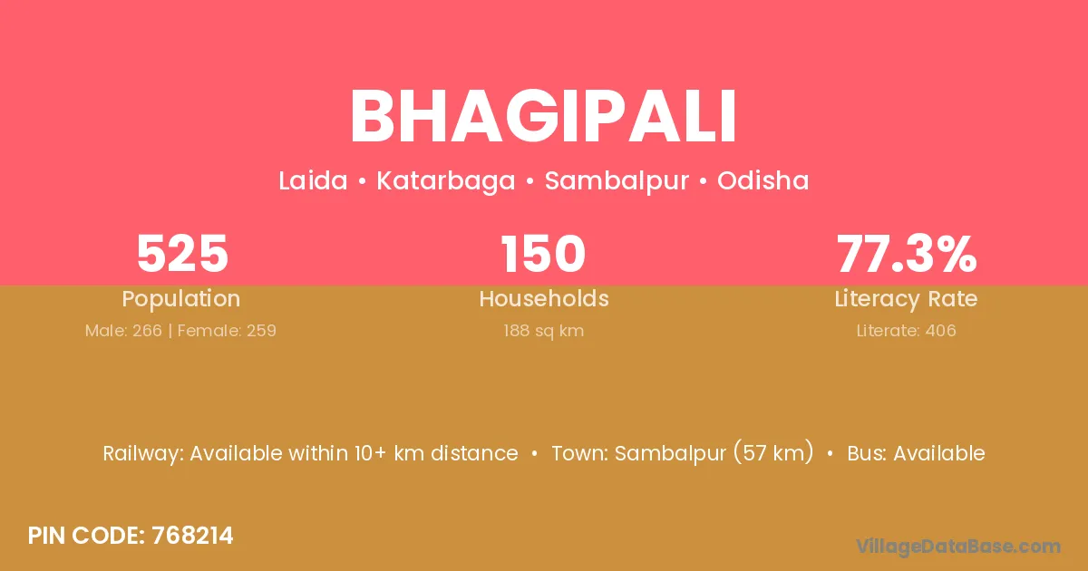 Jharsuguda (14 km) is the nearest town to Bhagipali village for major economic activities and is located approximately 14 km away.