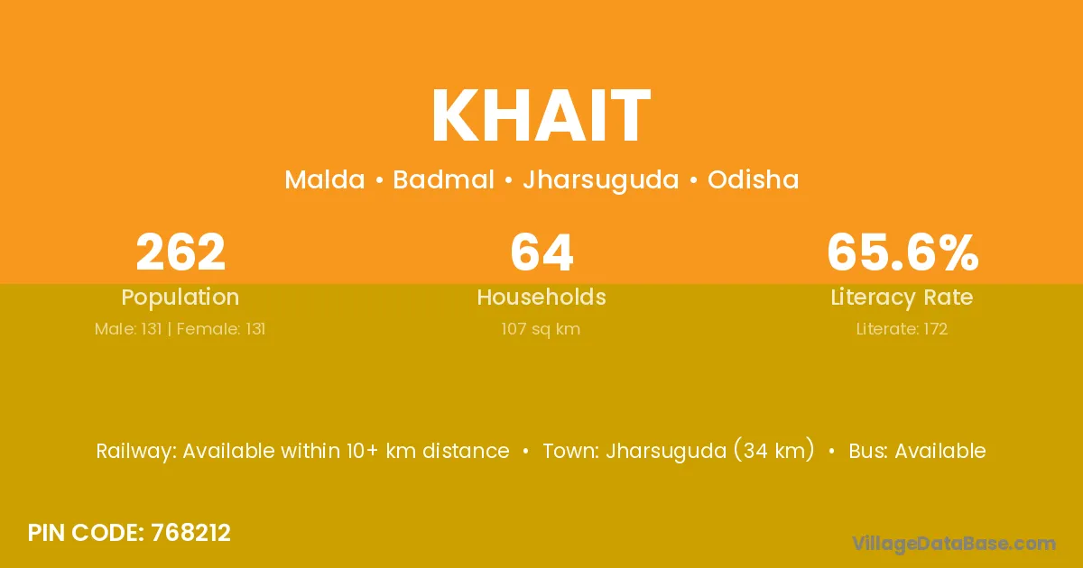 Jharsuguda (34 km) is the nearest town to Khait village for major economic activities and is located approximately 34 km away.
