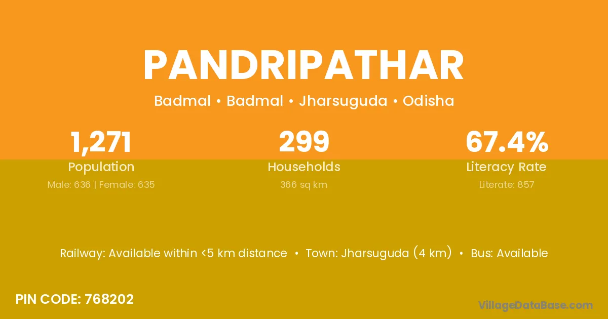 Jharsuguda (4 km) is the nearest town to Pandripathar village for major economic activities and is located approximately 4 km away.