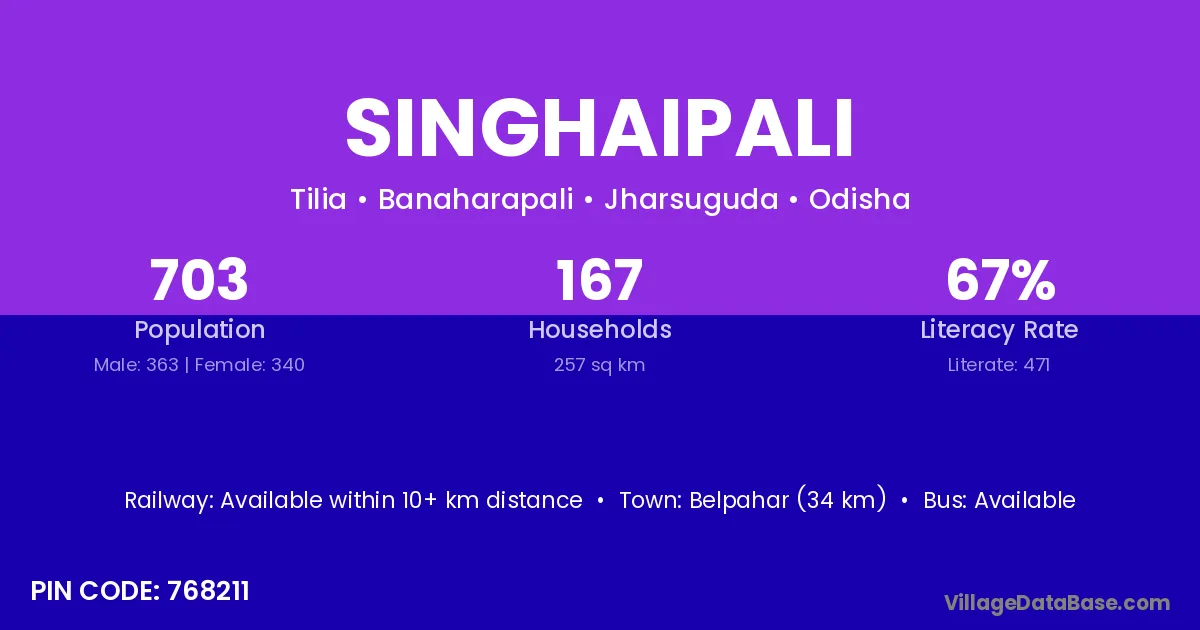 Belpahar (34 km) is the nearest town to Singhaipali village for major economic activities and is located approximately 34 km away.