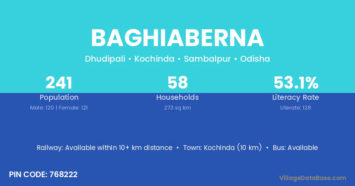 Jharsuguda (22 km) is the nearest town to Baghiaberna village for major economic activities and is located approximately 22 km away.