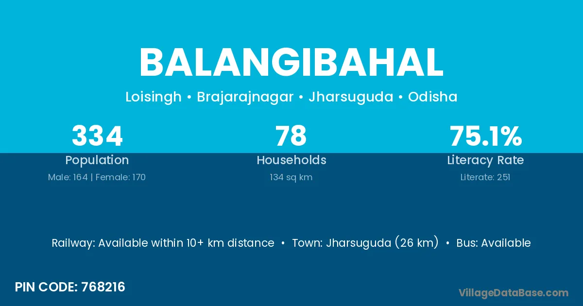 Jharsuguda (26 km) is the nearest town to Balangibahal village for major economic activities and is located approximately 26 km away.
