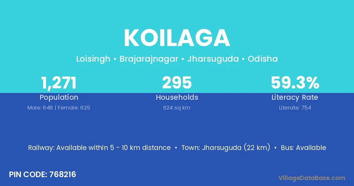 Jharsuguda (22 km) is the nearest town to Koilaga village for major economic activities and is located approximately 22 km away.