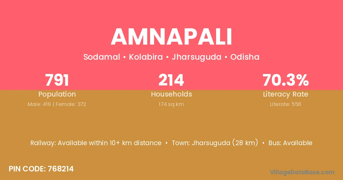 Jharsuguda (28 km) is the nearest town to Amnapali village for major economic activities and is located approximately 28 km away.