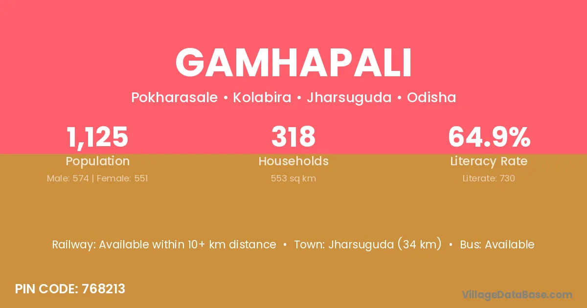 Jharsuguda (34 km) is the nearest town to Gamhapali village for major economic activities and is located approximately 34 km away.