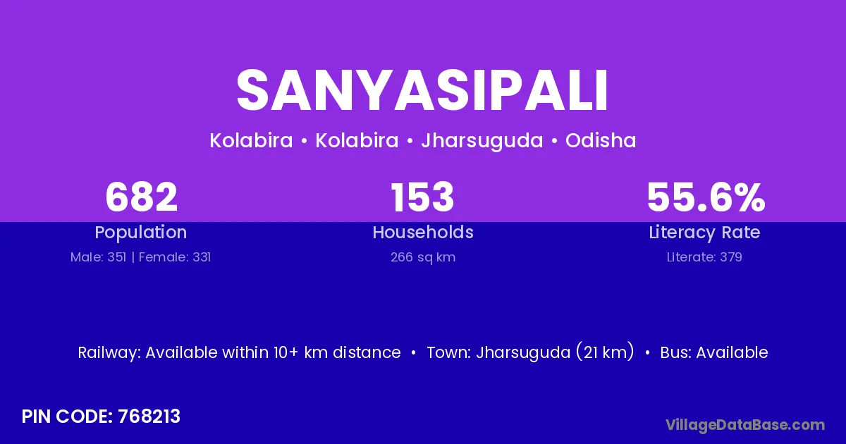 Jharsuguda (21 km) is the nearest town to Sanyasipali village for major economic activities and is located approximately 21 km away.